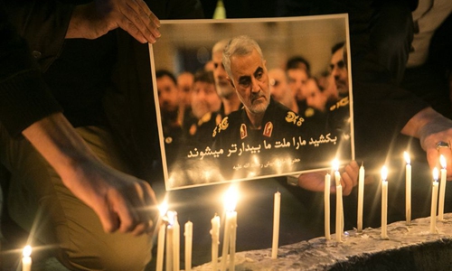 People light candles beside a poster of a top Iranian commander Qassem Soleimani during a mourning ceremony in Tehran, Iran, Jan. 3, 2020. (Photo by Ahmad Halabisaz/Xinhua)