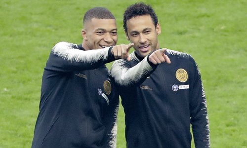PSG's Kylian Mbappe (left) and Neymar gesture before the French Cup final match between Rennais and PSG in Paris on April 27. Photo: IC
