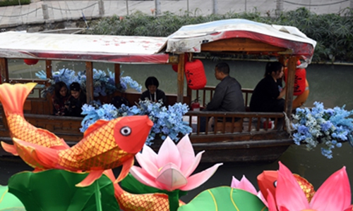 Artificial flowers decorate the banks of a river of Guangzhou, capital of South China's Guangdong Province on Saturday in advance of Chinese New Year which falls on January 25 this year. Photo: CNSPhoto