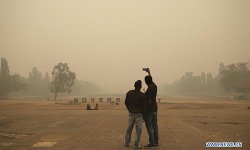 People pose for a selfie amid bushfire smoke near the Old Parliament House in Canberra, Australia, Jan. 5, 2020. Australia's bushfire crisis, which has seen more than 1,500 homes destroyed and at least 23 confirmed deaths according to The Australian newspaper, were expected to be exacerbated by catastrophic conditions forecast for Saturday. (Photo by Chu Chen/Xinhua)