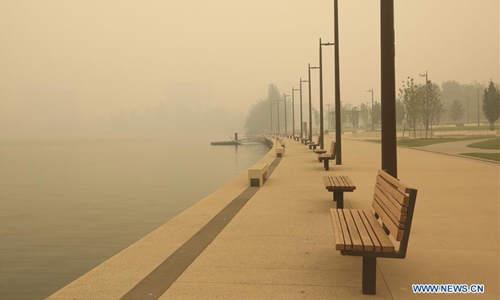 A park next to Lake Burley Griffin is shrouded in bushfire smoke in Canberra, Australia, Jan. 5, 2020. Australia's bushfire crisis, which has seen more than 1,500 homes destroyed and at least 23 confirmed deaths according to The Australian newspaper, were expected to be exacerbated by catastrophic conditions forecast for Saturday. (Photo by Chu Chen/Xinhua)