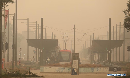 A light-rail station is shrouded in bushfire smoke in Canberra, Australia, Jan. 5, 2020. Australia's bushfire crisis, which has seen more than 1,500 homes destroyed and at least 23 confirmed deaths according to The Australian newspaper, were expected to be exacerbated by catastrophic conditions forecast for Saturday. (Photo by Chu Chen/Xinhua)