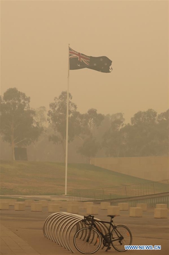 An Australian national flag is shrouded in bushfire smoke in Canberra, Australia, Jan. 5, 2020. Australia's bushfire crisis, which has seen more than 1,500 homes destroyed and at least 23 confirmed deaths according to The Australian newspaper, were expected to be exacerbated by catastrophic conditions forecast for Saturday. (Photo by Chu Chen/Xinhua)