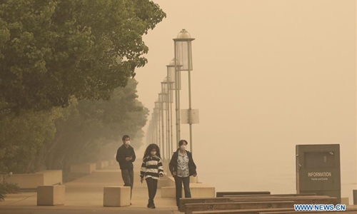 People wear facial masks as protection against bushfire smoke as they walk by Lake Burley Griffin in Canberra, Australia, Jan. 5, 2020. Australia's bushfire crisis, which has seen more than 1,500 homes destroyed and at least 23 confirmed deaths according to The Australian newspaper, were expected to be exacerbated by catastrophic conditions forecast for Saturday. (Photo by Chu Chen/Xinhua)