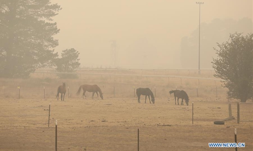 Four horses graze amid bushfire smoke in Canberra, Australia, Jan. 5, 2020. Australia's bushfire crisis, which has seen more than 1,500 homes destroyed and at least 23 confirmed deaths according to The Australian newspaper, were expected to be exacerbated by catastrophic conditions forecast for Saturday. (Photo by Chu Chen/Xinhua)