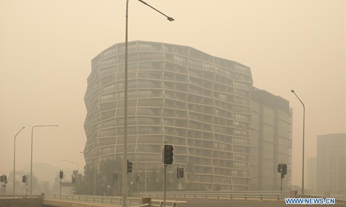 A building is shrouded in bushfire smoke in downtown Canberra, Australia, Jan. 5, 2020. Australia's bushfire crisis, which has seen more than 1,500 homes destroyed and at least 23 confirmed deaths according to The Australian newspaper, were expected to be exacerbated by catastrophic conditions forecast for Saturday. (Photo by Chu Chen/Xinhua)
