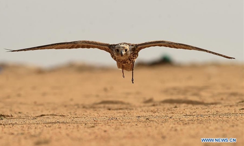 A falcon flies during a hunting show in Jahra Governorate, Kuwait, Jan. 4, 2020. Kuwaiti falcon lovers held on Saturday a falcon hunting show in the desert of Jahra Governorate of Kuwait. (Xinhua)