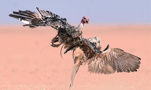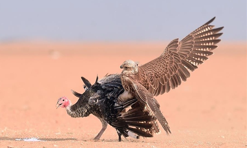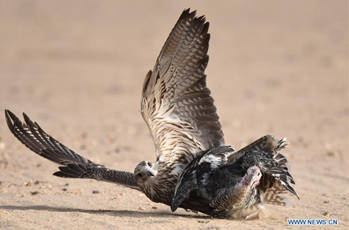 A falcon hunts during a hunting show in Jahra Governorate, Kuwait, Jan. 4, 2020. Kuwaiti falcon lovers held on Saturday a falcon hunting show in the desert of Jahra Governorate of Kuwait. (Xinhua)