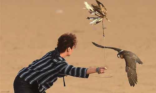 A woman trains a falcon during a hunting show in Jahra Governorate, Kuwait, Jan. 4, 2020. Kuwaiti falcon lovers held on Saturday a falcon hunting show in the desert of Jahra Governorate of Kuwait. (Xinhua)