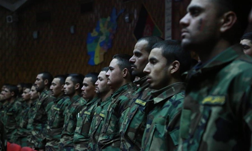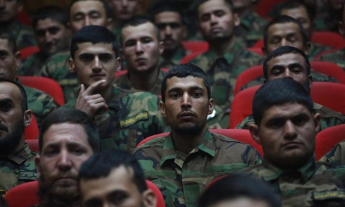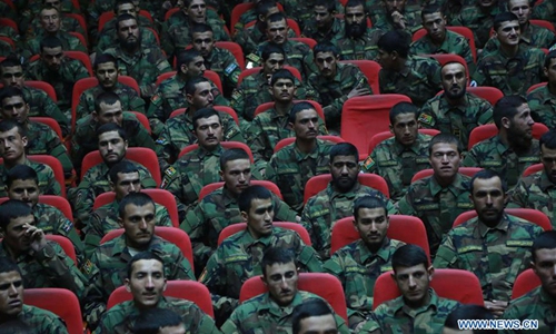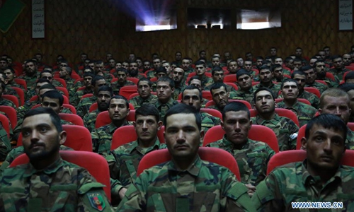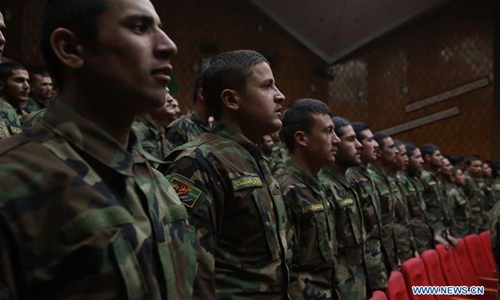 Afghan army soldiers take part in their graduation ceremony at Kabul Military Training Center (KMTC) in Kabul, Afghanistan, Jan. 5, 2020. A total of 1,090 youths were enlisted in the country's national army on Sunday after completing a 12-week military training and receiving certificates, the commander of KMTC said. (Xinhua/Rahmatullah Alizadah)