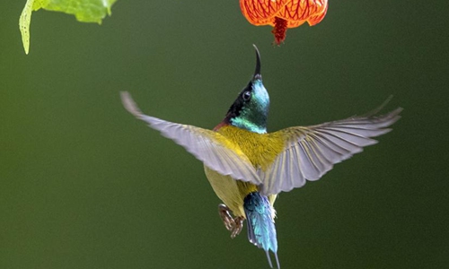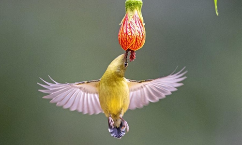A fork-tailed sunbird eats the nectar of a flower at the West Lake Park in Fuzhou, capital of southeast China's Fujian Province, Jan. 3, 2020. Photo:Xinhua