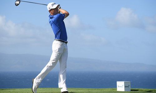 Justin Thomas plays his shot from the 10th tee during the final round of the Tournament of Champions at the Kapalua Plantation Course on Sunday in Kapalua, Hawaii. Photo: AFP