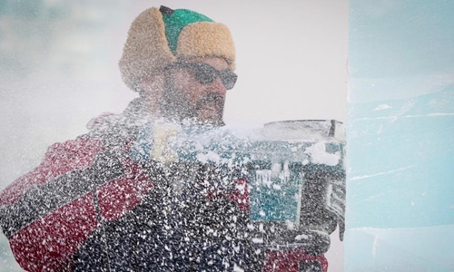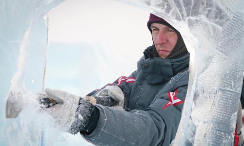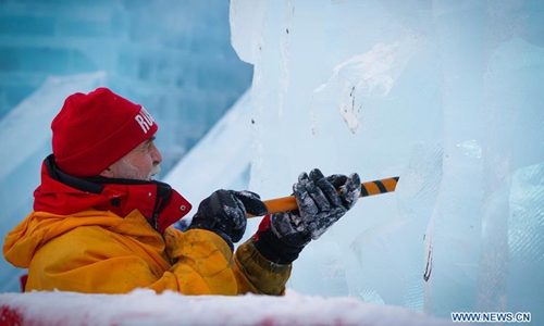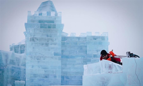 A competitor carves ice sculptures during the 34th Harbin International Ice Sculpture Competition at Harbin Ice-Snow World in northeast China's Heilongjiang Province, Jan. 6, 2020. (Xinhua/Wang Song)