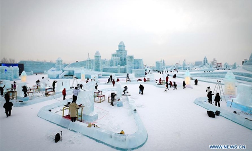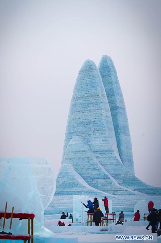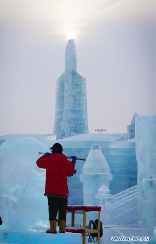 Competitors carve ice sculptures during the 34th Harbin International Ice Sculpture Competition at Harbin Ice-Snow World in northeast China's Heilongjiang Province, Jan. 6, 2020. (Xinhua/Wang Song)