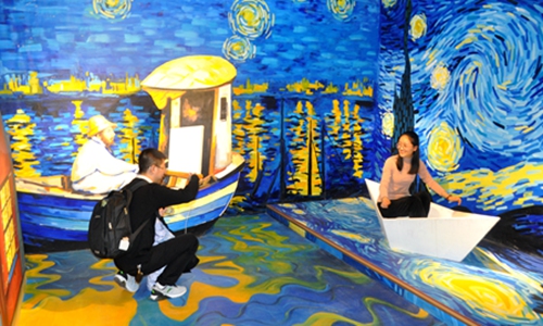 An art installation featuring life-sized renderings of paintings by Vincent van Gogh draws visitors to a shopping mall in East China's Shanghai Municipality on Sunday. Photo: cnsphot