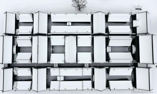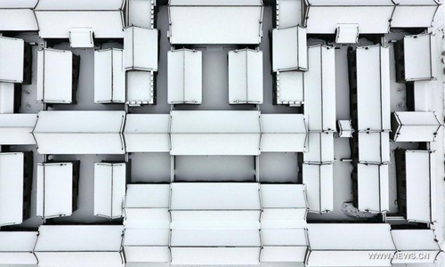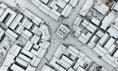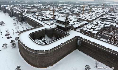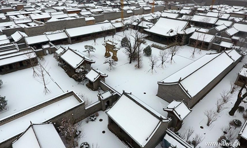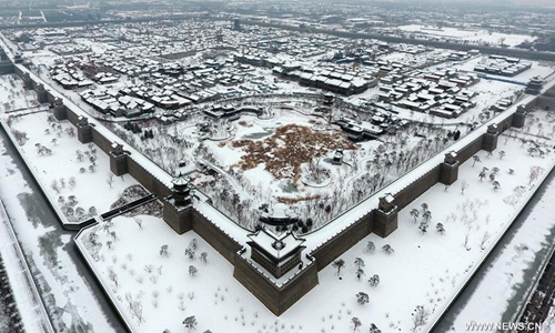 Aerial photo taken on Jan. 7, 2020 shows the snow scenery of the Taiyuan Ancient County in Taiyuan City, capital of north China's Shanxi Province. The Taiyuan Ancient County is part of the Jinyang Ancient City relics found in today's Taiyuan city. It is dubbed the "Phoenix County" due to its overall layout that resembles a soaring phoenix. Photo:Xinhua