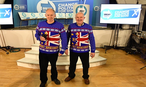 Brexit Party supporters Barry Clarkson (left) and Alastair Sutcliffe pose in matching Brexit Christmas jumpers prior to a party rally in Buckley, north Wales on Monday. Photo: AFP