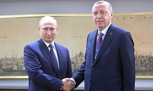 Russian President Vladimir Putin shakes hands with Turkish President Recep Tayyip Erdogan in Istanbul on Jan. 8, 2020. Photo: Xinhua/Kremlin photo