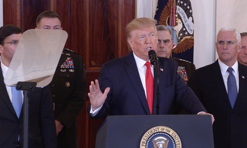 US President Donald Trump (C) delivers a statement at the White House in Washington D.C., the United States, Jan. 8, 2020. Donald Trump said on Wednesday that no U.S. casualties have resulted from Iran's missiles attack against U.S. forces in Iraq on Tuesday, adding that the United States would impose additional sanctions against Tehran. Photo:Xinhua
