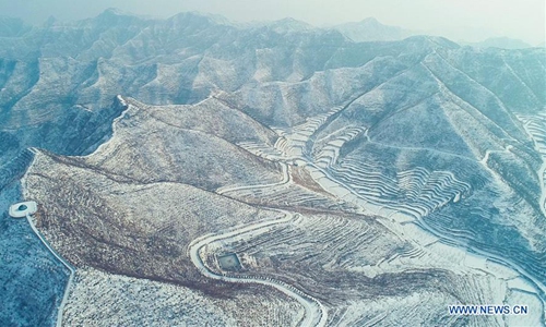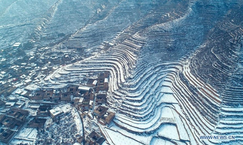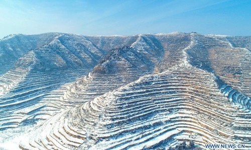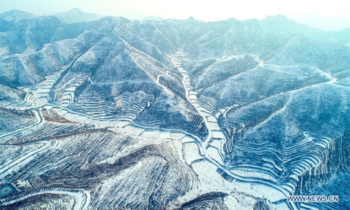 Aerial photo taken on Jan. 8, 2020 shows the snow-covered terraced fields in Houchi Village of Shexian County, north China's Hebei Province. Photo:Xinhua