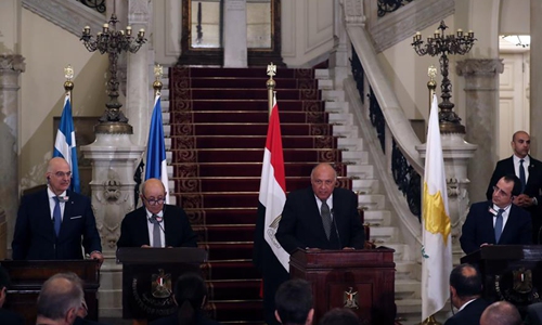 Egyptian Foreign Minister Sameh Shoukry (2rd R), Greek Foreign Minister Nikos Dendias (1st L), French Foreign Minister Jean-Yves Le Drian (2nd L) and Cypriot Foreign Minister Nicos Christodoulides attend a press conference in Cairo, Egypt, on Jan. 8, 2020. The foreign ministers of Egypt, France, Greece and Cyprus described as "invalid" the two deals signed between Turkey and Libya's UN-backed government on maritime boundaries delimitation and security, the Egyptian Foreign Ministry said in a statement on Wednesday. The foreign ministers met in Cairo on Wednesday and agreed in a concluding statement that the Turkish deals signed in November with the UN-backed Government of National Accord (GNA) led by Fayez al-Serraj violate relevant UN Security Council resolutions and contradict the international law. Photo:Xinhua