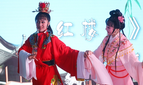 Performers wearing traditional Chinese silk outfits, sing a duet from Dream of the Red Chamber, one of China's four great ancient novels, in Nanjing, East China's Jiangsu Province on Wednesday. Photo: cnsphoto