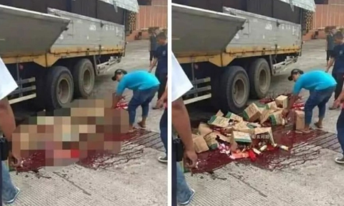 The third was a photo showing a man lying in blood, and it was shown alongside the rumor that Uygur people are being murdered. However, the photo was taken following a car accident in Indonesia, and the "blood" was in reality syrup that had spilled from a truck.