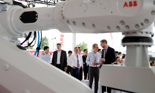 Guests talk with each other during the groundbreaking ceremony of ABB Robotics Factory of the Future in Shanghai, east China, Sept. 12, 2019. (Xinhua/Fang Zhe)