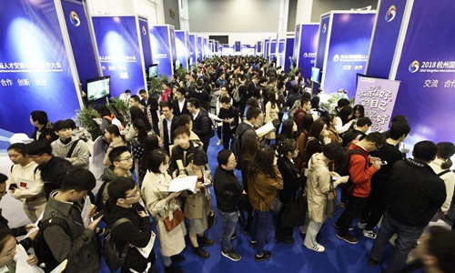 Job applicants are seen at the 2018 Hangzhou International Human Resources Exchanges and Cooperation Conference in Hangzhou, east China's Zhejiang Province, Nov. 10, 2018. (Xinhua/Li Zhong)