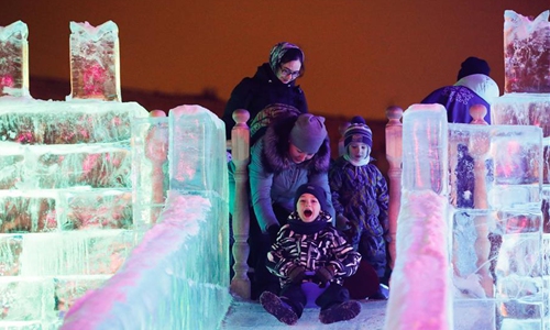 A child slides down an ice slide at the Ice Moscow festival in Moscow, Russia, Jan. 12, 2020. More than 100 ice sculptures were presented at the festival, depicting notable examples of Russian national heritage and achievements from the ancient times until modern era. (Photo by Maxim Chernavsky/Xinhua)