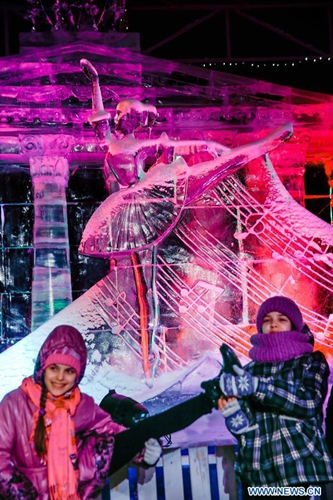 Girls pose for a photo with an ice sculpture of a ballerina at the Ice Moscow festival in Moscow, Russia, Jan. 12, 2020. More than 100 ice sculptures were presented at the festival, depicting notable examples of Russian national heritage and achievements from the ancient times until modern era. (Photo by Maxim Chernavsky/Xinhua)