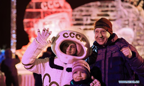 Visitors pose for photos in front of the ice sculpture of astronaut Yuri Gagarin at the Ice Moscow festival in Moscow, Russia, Jan. 12, 2020. More than 100 ice sculptures were presented at the festival, depicting notable examples of Russian national heritage and achievements from the ancient times until modern era. (Photo by Maxim Chernavsky/Xinhua)