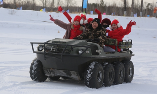 A driver of an eight-wheeled vehicle wears an embarrassed smile, as five young women in the same winter outfit wave during the ice and snow festival held in Heihe, a China-Russia border city in Northeast China's Heilongjiang Province on Sunday. Photo: cnsphoto
