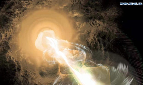 Picture shows a high-resolution image of the most distant known blazar, produced by a team led by Chinese astronomers. A team led by Chinese astronomers has produced high-resolution images of the most distant known blazar, which they say could help study the evolvement of galaxies born in the early universe, said an article published this week by Nature Communications. "The object is one of the most distant ones known to date in the class of active galactic nucleus," said An Tao, the team leader and a researcher at the Shanghai Astronomical Observatory. (Xinhua)