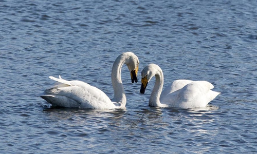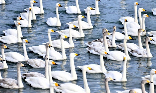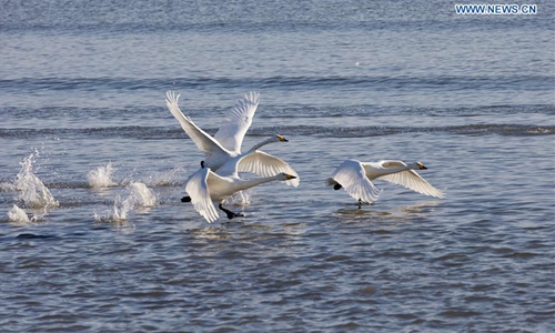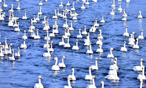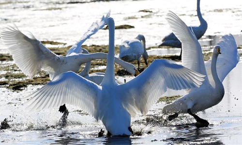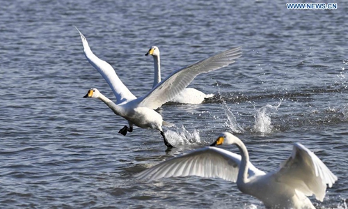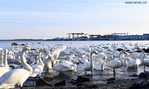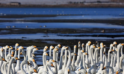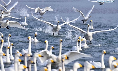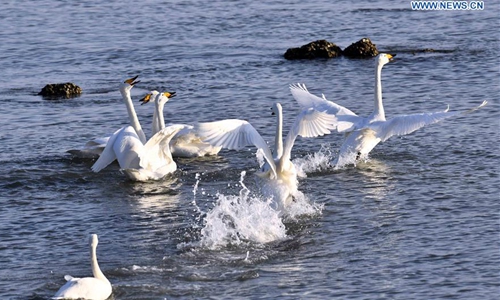 Photo taken on Jan. 12, 2020 shows whooper swans at the national nature reserve for whooper swans in Rongcheng City, east China's Shandong Province. With unique geographical location and comprehensive ecological protection of wetlands, Rongcheng provides favorable natural conditions for thousands of whooper swans to spend winter. The nature reserve for whooper swans here was established in 1985 and promoted to the state level in 2007. Photo:Xinhua