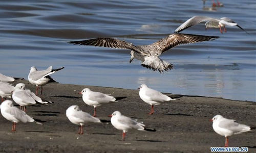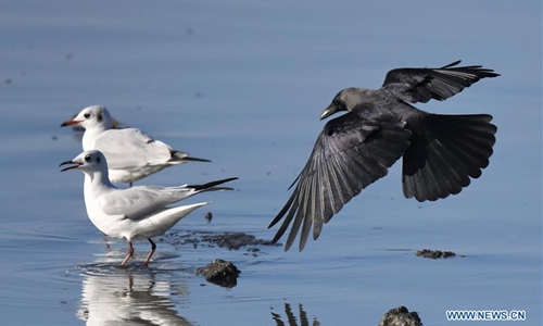 Birds forage near a beach of Kuwait City, Kuwait, Jan. 12, 2020. Photo:Xinhua