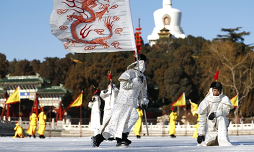 Skaters wearing Qing Dynasty (1644-1911) outfits play Bingxi, an ancient winter sport, on a frozen lake in downtown Beijing on Monday. Photo: cnsphoto