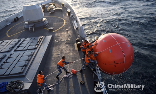Sailors of the guided-missile frigate Yuncheng (Hull 571) drop a floating target over board during the maritime phase of the Sea Guardians 2020 in waters of the northern Arabian Sea on January 10, local time.(eng.chinamil.com.cn/Photo by Mu Ruilin)