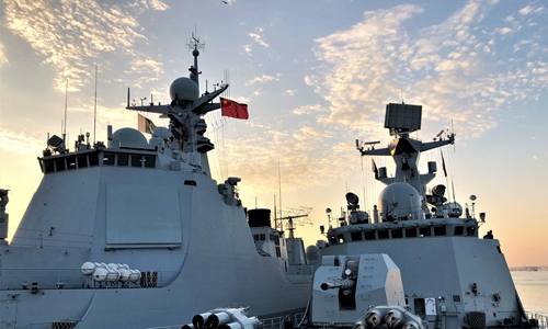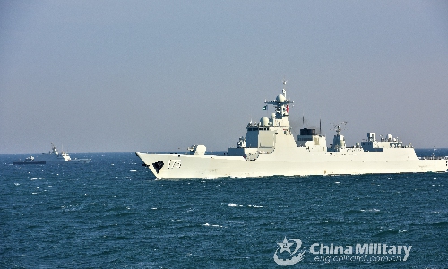 The Chinese and Pakistani naval ships steam in formation in waters of the northern Arabian Sea.(eng.chinamil.com.cn/Photo by Mu Ruilin)