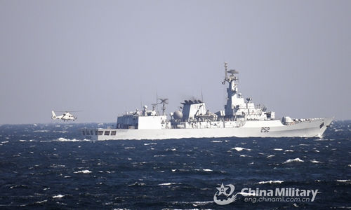 The Pakistani ship (Hull 1013) and the Chinese guided-missile destroyer Yinchuan (Hull 175) steam alongside with each other during the drill on January 10, local time. (eng.chinamil.com.cn/Photo by Dong Zhaohui)