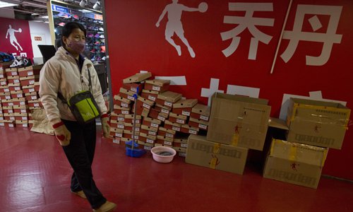 A shopper walks past a Qiaodan Sportswear retail shop in Beijing in 2016. Photo: AP