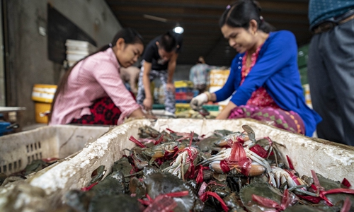 Workers sort crabs imported from Myanmar at a market in Ruili City, southwest China's Yunnan Province, Nov. 5, 2019. Photo:Xinhua