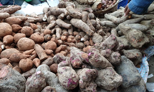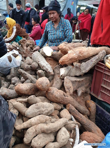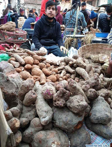 A vendor sells yam, locally known as tarul, on the eve of Maghe Sankranti festival at a local market of Ason in Kathmandu, Nepal, Jan. 14, 2020. Nepalese people consume various kinds of yams, either boiled or with some condiments, in celebration of Maghe Sankranti festival and even to welcome winter season. Photo:Xinhua