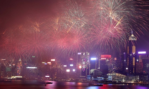Photo taken on Feb. 6, 2019 shows fireworks illuminate the sky over the Victoria Harbor in Hong Kong, south China, to celebrate the Spring Festival. Photo:Xinhua
