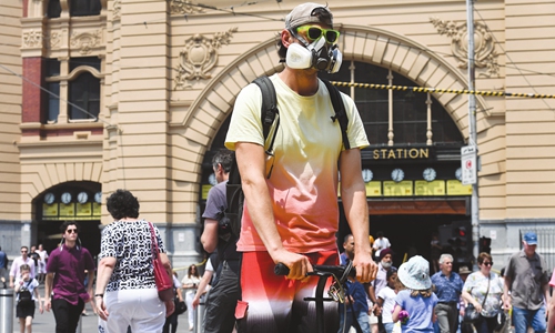 A commuter riding his scooter wears a mask as poor air quality from Australia's bushfires have hampered qualifying for the upcoming Australian Open tennis tournament in Melbourne, Australia on Wednesday. Photo: AFP