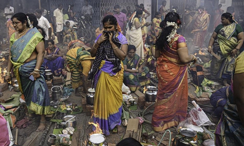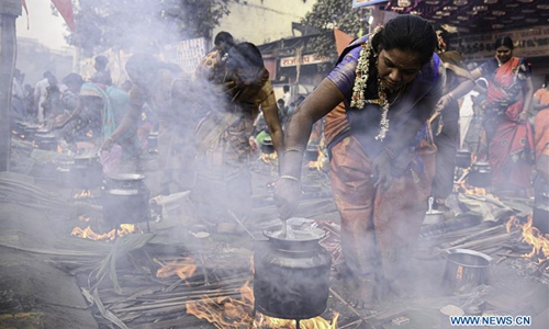 Women from Tamil community cook traditional rice to celebrate "Pongal" in Mumbai, India, Jan. 15, 2020. (Xinhua/Fariha Farooqui)
