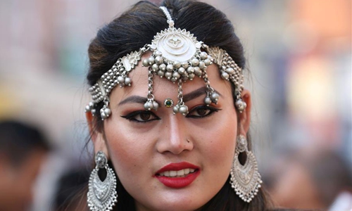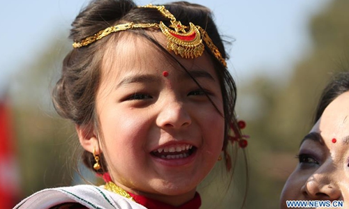 A girl from Magar community reacts as she takes part in celebrations of Maghe Sankranti festival to mark the beginning of the warmer season in Kathmandu, capital of Nepal, Jan. 15, 2020. Photo:Xinhua