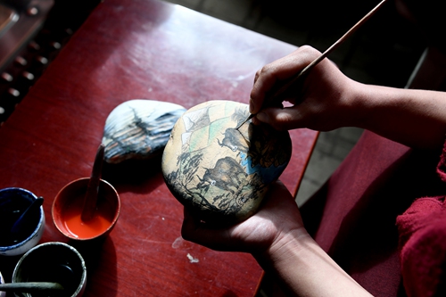 A painter is drawing a Tangka featuring yaks on a stone.