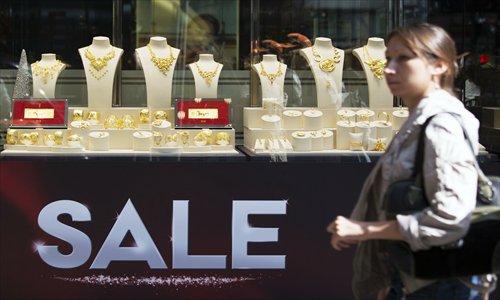 A woman walks past a sale sign displayed below gold jewelry in the window of a Chow Tai Fook store in the shopping district of Tsim Sha Tsui in Hong Kong on November 26, 2013. Photo: CFP