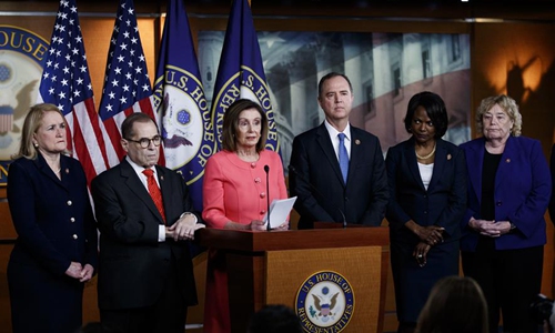 U.S. House Speaker Nancy Pelosi (3rd L) speaks during a press conference in Washington D.C., the United States, on Jan. 15, 2020. The U.S. House of Representatives officially sent impeachment articles against President Donald Trump to the Senate on Wednesday evening to allow a trial to get underway. Photo:Xinhua